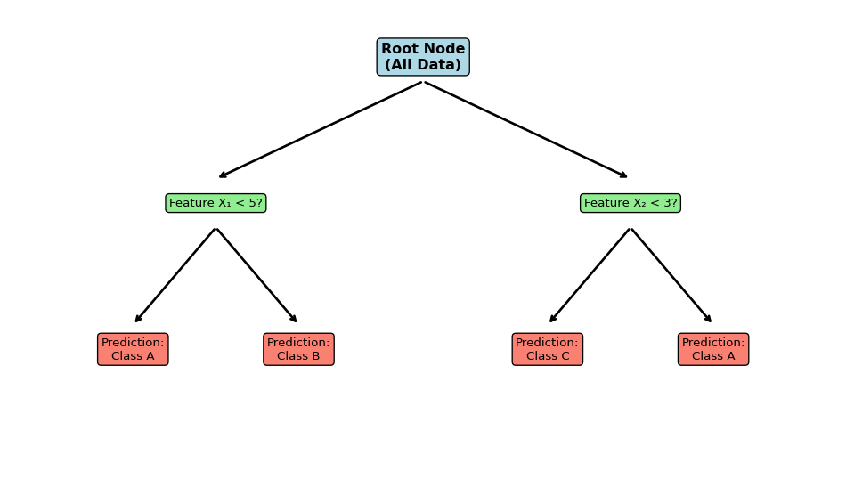 import matplotlib.pyplot as pltimport numpy as np# Create figurefig, ax = plt.subplots(1, 1, figsize=(10, 6))# Create a simple tree structureax.text(0.5, 0.9, 'Root Node\n(All Data)', ha='center', va='center', bbox=dict(boxstyle="round,pad=0.3", facecolor='lightblue'), fontsize=12, fontweight='bold')# Left branchax.text(0.25, 0.6, 'Feature X₁ < 5?', ha='center', va='center', bbox=dict(boxstyle="round,pad=0.3", facecolor='lightgreen'), fontsize=10)# Right branch ax.text(0.75, 0.6, 'Feature X₂ < 3?', ha='center', va='center', bbox=dict(boxstyle="round,pad=0.3", facecolor='lightgreen'), fontsize=10)# Terminal nodesax.text(0.15, 0.3, 'Prediction:\nClass A', ha='center', va='center', bbox=dict(boxstyle="round,pad=0.3", facecolor='salmon'), fontsize=10)ax.text(0.35, 0.3, 'Prediction:\nClass B', ha='center', va='center', bbox=dict(boxstyle="round,pad=0.3", facecolor='salmon'), fontsize=10)ax.text(0.65, 0.3, 'Prediction:\nClass C', ha='center', va='center', bbox=dict(boxstyle="round,pad=0.3", facecolor='salmon'), fontsize=10)ax.text(0.85, 0.3, 'Prediction:\nClass A', ha='center', va='center', bbox=dict(boxstyle="round,pad=0.3", facecolor='salmon'), fontsize=10)# Draw arrowsarrows = [ ((0.5, 0.85), (0.25, 0.65)), # Root to left ((0.5, 0.85), (0.75, 0.65)), # Root to right ((0.25, 0.55), (0.15, 0.35)), # Left to terminal ((0.25, 0.55), (0.35, 0.35)), # Left to terminal ((0.75, 0.55), (0.65, 0.35)), # Right to terminal ((0.75, 0.55), (0.85, 0.35)), # Right to terminal]for start, end in arrows: ax.annotate('', xy=end, xytext=start, arrowprops=dict(arrowstyle='->', lw=2, color='black'))ax.set_xlim(0, 1)ax.set_ylim(0, 1)ax.axis('off')plt.tight_layout()plt.show()