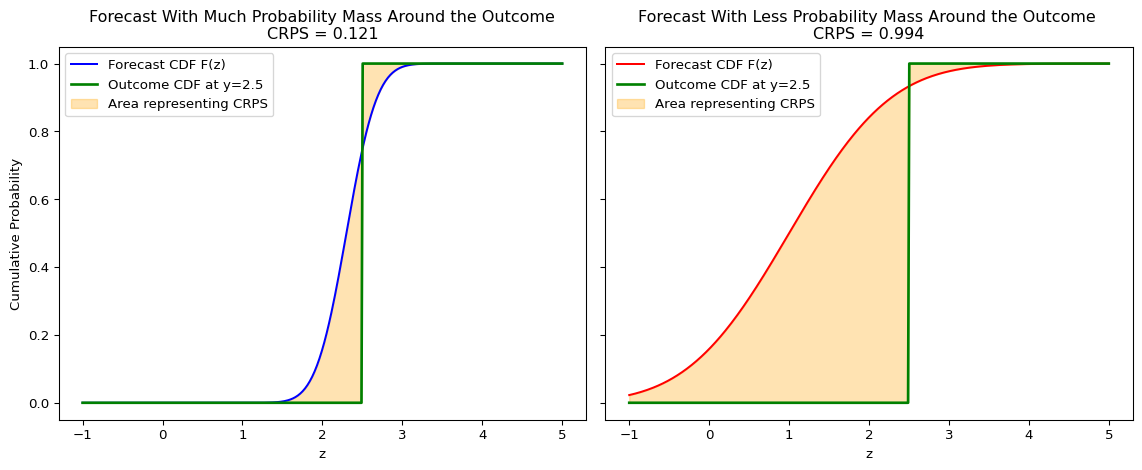 The CRPS measures the squared difference between the forecast CDF, \(F(z)\), and the empirical CDF of the outcome, which is a step function at \(y\). If the forecast places substantial probability mass near the realization, the shaded area is smaller and the CRPS is better, i.e. lower.