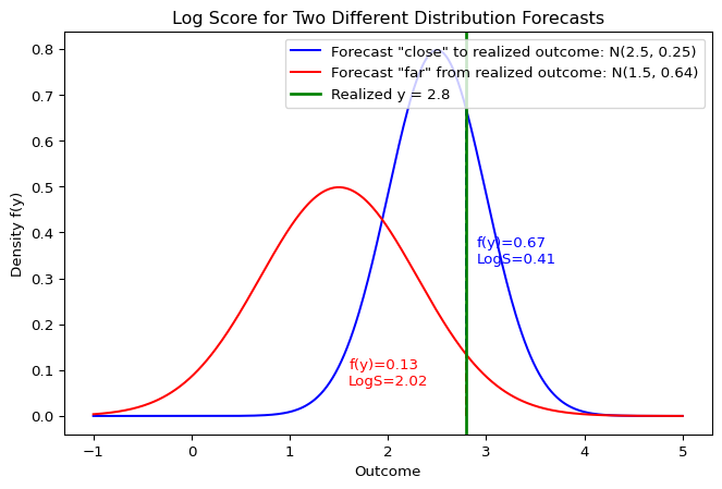 The Log Score directly depends on the height of the density at the realized outcome \(y\). A forecast that assigns a higher probability to the value that actually occurs will receive a better, i.e. lower, score.