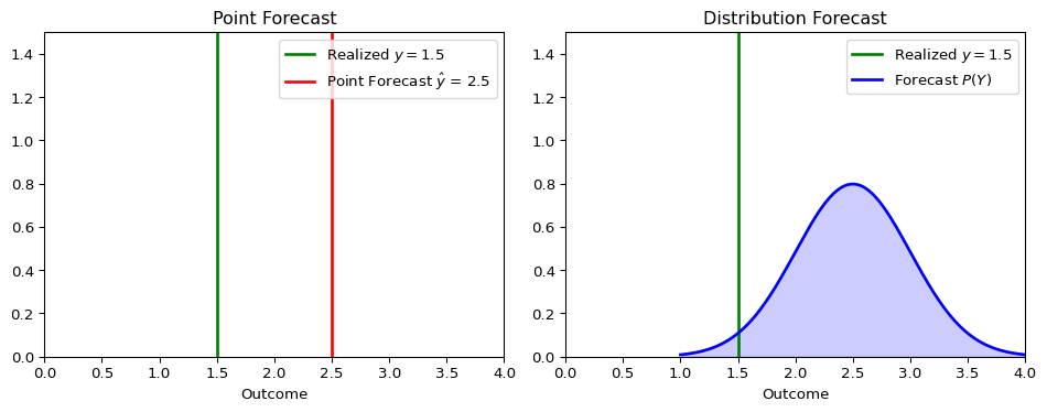 Suppose we forecast that an outcome follows a Normal distribution \(Y \sim \mathcal{N}(\mu=2, \sigma^2=1)\), and the realized value is \(y = 2.5\).