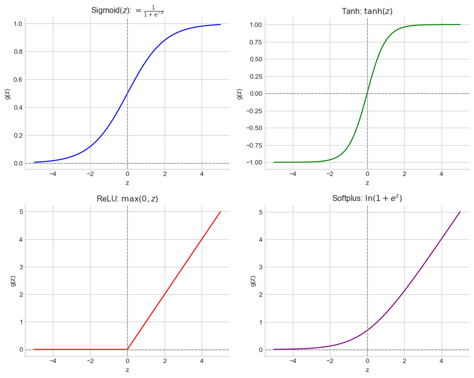 Figure 5.2: The four most common activation functions — Sigmoid, Tanh, ReLU, and Softplus — plotted against the pre-activation input \(z\) (x-axis) and their output \(g(z)\) (y-axis), arranged in a 2×2 grid. Dashed reference lines mark zero on both axes.