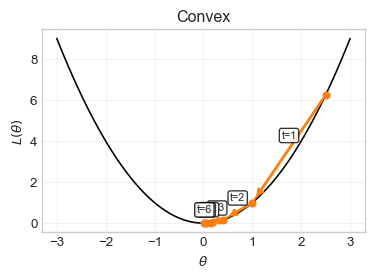 OLS also minimizes squared loss, but its fitted value is linear in the parameter vector. That makes the OLS objective quadratic and therefore convex.