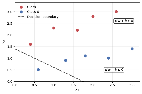 Figure 5.1: A single perceptron classifies observations by applying an activation to a linear index. The dashed line is the zero-index decision boundary \(x_2 = 1.4 - 0.8x_1\). Points on opposite sides of the boundary receive different classifications.