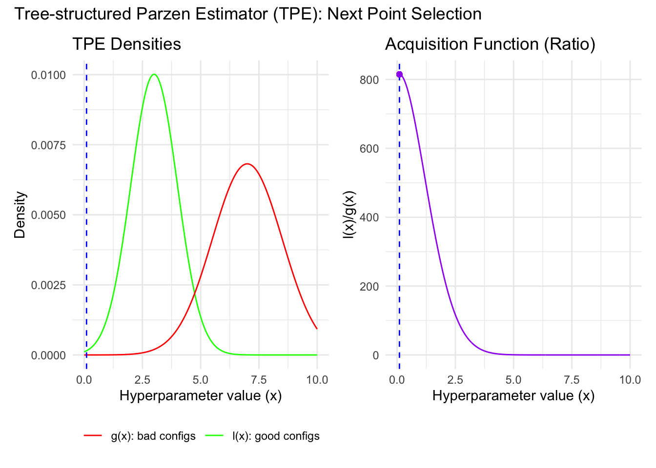 TPE would prefer configuration B because it has the largest ratio \(\ell(\lambda)/g(\lambda)\). That means B looks relatively likely under the density fitted to historically good trials and relatively unlikely under the density fitted to bad trials. Economically, the algorithm is concentrating scarce validation budget on a region of the search space that past evidence suggests is more promising.