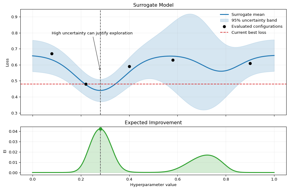 Figure 14.4: Stylized Bayesian-optimization example in one hyperparameter dimension. The top panel shows a surrogate mean for validation loss, a 95% uncertainty band, previously evaluated configurations, and the current best observed loss. The bottom panel shows the resulting expected-improvement function. The dashed vertical line marks the next candidate selected by maximizing expected improvement, which reflects both predicted loss and uncertainty.