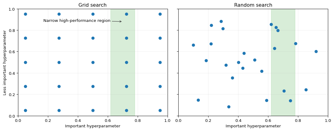 Figure 14.3: Stylized comparison of grid search and random search under low effective dimensionality. Each panel shows 25 evaluated configurations in a two-hyperparameter space. The shaded vertical band marks a narrow high-performance region in the important horizontal hyperparameter, while the vertical axis is less consequential. Random search produces more distinct draws along the important direction than the equally sized grid.