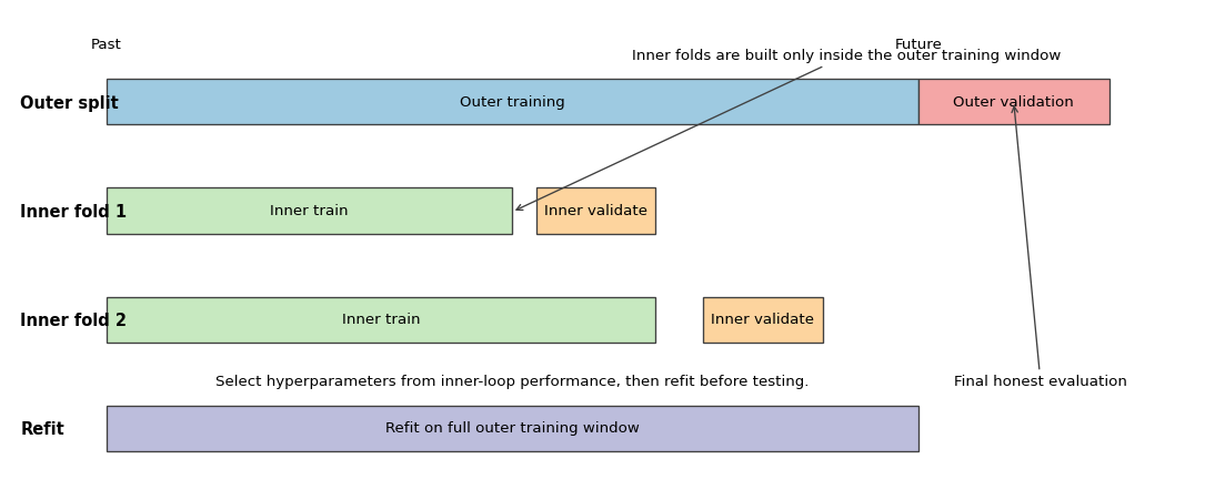 import matplotlib.pyplot as pltfrom matplotlib.patches import Rectanglefig, ax = plt.subplots(figsize=(11.5, 4.8))ax.set_xlim(0, 100)ax.set_ylim(0, 4.4)ax.axis("off")rows = [ (3.35, "Outer split", [(8, 68, "Outer training", "#9ecae1"), (76, 16, "Outer validation", "#f4a6a6")]), (2.35, "Inner fold 1", [(8, 34, "Inner train", "#c7e9c0"), (44, 10, "Inner validate", "#fdd49e")]), (1.35, "Inner fold 2", [(8, 46, "Inner train", "#c7e9c0"), (58, 10, "Inner validate", "#fdd49e")]), (0.35, "Refit", [(8, 68, "Refit on full outer training window", "#bcbddc")]),]for y, label, blocks in rows: ax.text(0.8, y +0.2, label, ha="left", va="center", fontsize=11, fontweight="bold")for x0, width, text, color in blocks: rect = Rectangle((x0, y), width, 0.42, facecolor=color, edgecolor="0.25", linewidth=1.0) ax.add_patch(rect) ax.text(x0 + width /2, y +0.21, text, ha="center", va="center", fontsize=10)for xpos, text in [(8, "Past"), (76, "Future")]: ax.text(xpos, 4.02, text, ha="center", va="bottom", fontsize=10)ax.annotate("Inner folds are built only inside the outer training window", xy=(42, 2.55), xytext=(52, 3.95), arrowprops={"arrowstyle": "->", "color": "0.25"}, fontsize=10,)ax.annotate("Final honest evaluation", xy=(84, 3.56), xytext=(79, 0.95), arrowprops={"arrowstyle": "->", "color": "0.25"}, fontsize=10,)ax.text(42, 0.95, "Select hyperparameters from inner-loop performance, then refit before testing.", ha="center", fontsize=10)plt.tight_layout()plt.show()