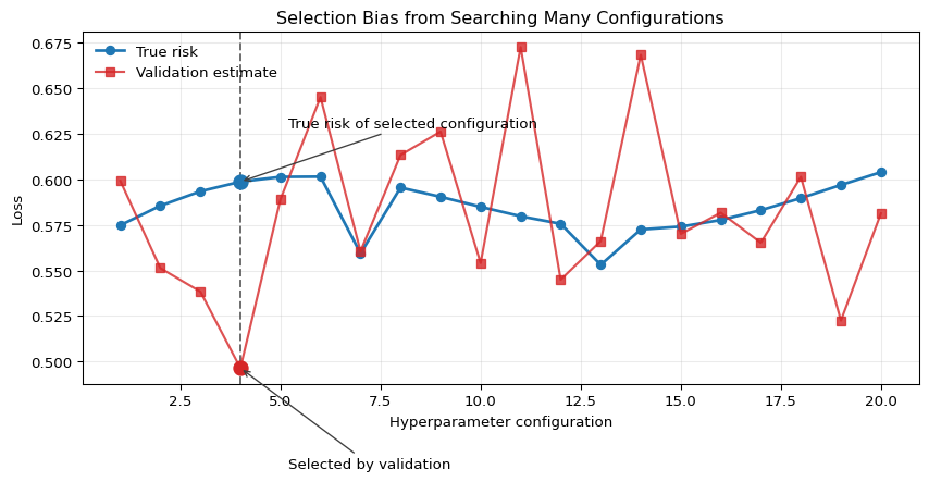Figure 14.1: Illustration of selection bias from hyperparameter search. The horizontal axis indexes 20 candidate configurations. The blue line shows each configuration’s true risk, the red line shows a noisy validation estimate, and the dashed vertical line marks the configuration selected by minimizing validation loss. For the selected configuration, the realized validation loss lies below the true risk, illustrating how search can make the winner look too good.