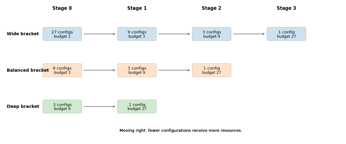 Suppose one successive-halving bracket starts with 27 configurations trained for 3 epochs each. How many configurations remain after each elimination round, and what budget does each surviving configuration receive if the budget is multiplied by \(\eta\) at each stage?