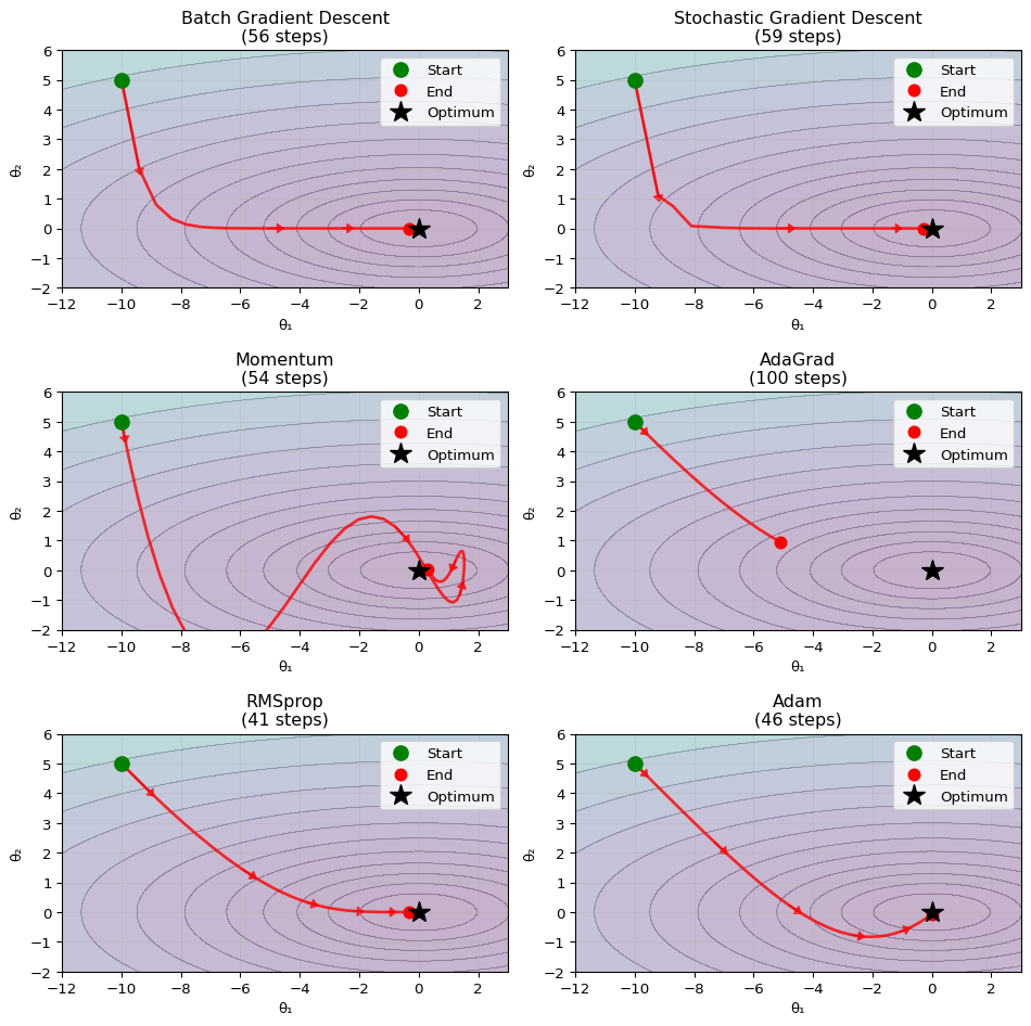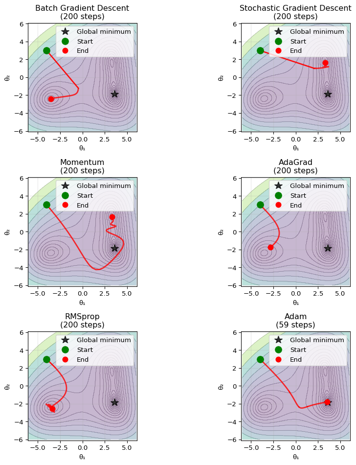 import numpy as npimport matplotlib.pyplot as plt# Set random seed for reproducibilitynp.random.seed(42)# Define a more challenging non-convex function with multiple local minimadef f_nonconvex(x, y):return2/3* ((x**2+ y -11)**2+ (x + y**2-7)**2+ (x -4)**2* (y +2)**2)def df_nonconvex(x, y):# Partial derivative with respect to x dx = (2/3) * (4*x*(x**2+ y -11) +2*(x + y**2-7) +2*(x -4)*(y +2)**2)# Partial derivative with respect to y dy = (2/3) * (2*(x**2+ y -11) +4*y*(x + y**2-7) +2*(x -4)**2*(y +2))return dx, dy# Create contour plot for non-convex functionx_nc = np.linspace(-6, 6, 600)y_nc = np.linspace(-6, 6, 600)X_nc, Y_nc = np.meshgrid(x_nc, y_nc)Z_nc = f_nonconvex(X_nc, Y_nc)def run_optimizer_nonconvex(optimizer_func, x0, y0, **kwargs):"""Generic wrapper for running optimizers on non-convex function""" path = [(x0, y0)] x, y = x0, y0if'momentum'in optimizer_func.__name__: vx, vy =0, 0 lr = kwargs.get('lr', 0.3) beta = kwargs.get('beta', 0.9) n_steps = kwargs.get('n_steps', 200)for _ inrange(n_steps): gx, gy = df_nonconvex(x, y) vx = beta * vx + gx vy = beta * vy + gy x -= lr * vx y -= lr * vy path.append((x, y))if f_nonconvex(x, y) <1or np.isnan(x) or np.isnan(y):breakelif'adagrad'in optimizer_func.__name__: gx_sum_sq, gy_sum_sq =0, 0 lr = kwargs.get('lr', 0.3) eps = kwargs.get('eps', 1e-8) n_steps = kwargs.get('n_steps', 200)for step inrange(n_steps): gx, gy = df_nonconvex(x, y) gx_sum_sq += gx**2 gy_sum_sq += gy**2 effective_lr_x = lr / (np.sqrt(gx_sum_sq) + eps) effective_lr_y = lr / (np.sqrt(gy_sum_sq) + eps) x -= effective_lr_x * gx y -= effective_lr_y * gy path.append((x, y))if f_nonconvex(x, y) <1or np.isnan(x) or np.isnan(y):breakif step >10and effective_lr_x <1e-6and effective_lr_y <1e-6:breakelif'rmsprop'in optimizer_func.__name__: vx, vy =0, 0 lr = kwargs.get('lr', 0.3) gamma = kwargs.get('gamma', 0.9) eps = kwargs.get('eps', 1e-8) n_steps = kwargs.get('n_steps', 200)for _ inrange(n_steps): gx, gy = df_nonconvex(x, y) vx = gamma * vx + (1- gamma) * gx**2 vy = gamma * vy + (1- gamma) * gy**2 x -= lr * gx / (np.sqrt(vx) + eps) y -= lr * gy / (np.sqrt(vy) + eps) path.append((x, y))if f_nonconvex(x, y) <1or np.isnan(x) or np.isnan(y):breakelif'adam'in optimizer_func.__name__: mx, my =0, 0 vx, vy =0, 0 lr = kwargs.get('lr', 0.3) beta1 = kwargs.get('beta1', 0.9) beta2 = kwargs.get('beta2', 0.99) eps = kwargs.get('eps', 1e-8) n_steps = kwargs.get('n_steps', 200)for t inrange(1, n_steps +1): gx, gy = df_nonconvex(x, y) mx = beta1 * mx + (1- beta1) * gx my = beta1 * my + (1- beta1) * gy vx = beta2 * vx + (1- beta2) * gx**2 vy = beta2 * vy + (1- beta2) * gy**2 mx_hat = mx / (1- beta1**t) my_hat = my / (1- beta1**t) vx_hat = vx / (1- beta2**t) vy_hat = vy / (1- beta2**t) x -= lr * mx_hat / (np.sqrt(vx_hat) + eps) y -= lr * my_hat / (np.sqrt(vy_hat) + eps) path.append((x, y))if f_nonconvex(x, y) <1or np.isnan(x) or np.isnan(y):breakelif'sgd'in optimizer_func.__name__: lr = kwargs.get('lr', 0.3) n_steps = kwargs.get('n_steps', 200) np.random.seed(456) # Different seed for SGD noise data_variance =0.2for _ inrange(n_steps): gx_base, gy_base = df_nonconvex(x, y) gx_noise = np.random.normal(0, data_variance *abs(gx_base *5.3)) gy_noise = np.random.normal(0, data_variance *abs(gy_base *5.3)) gx = gx_base + gx_noise gy = gy_base + gy_noise x -= lr * gx y -= lr * gy path.append((x, y))if f_nonconvex(x, y) <1or np.isnan(x) or np.isnan(y):breakelse: # Batch GD lr = kwargs.get('lr', 0.3) n_steps = kwargs.get('n_steps', 200)for _ inrange(n_steps): gx, gy = df_nonconvex(x, y) x -= lr * gx y -= lr * gy path.append((x, y))if f_nonconvex(x, y) <1or np.isnan(x) or np.isnan(y):breakreturn np.array(path)# Define dummy functions for the wrapperdef run_batch_gd_nc(): passdef run_sgd_nc(): passdef run_momentum_nc(): passdef run_adagrad_nc(): passdef run_rmsprop_nc(): passdef run_adam_nc(): pass# Run all optimizers from the same challenging starting pointstart_x_nc, start_y_nc =-4, 3# Start far from any minimumpath_batch_nc = run_optimizer_nonconvex(run_batch_gd_nc, start_x_nc, start_y_nc, lr=0.01)path_sgd_nc = run_optimizer_nonconvex(run_sgd_nc, start_x_nc, start_y_nc, lr=0.01)path_momentum_nc = run_optimizer_nonconvex(run_momentum_nc, start_x_nc, start_y_nc, lr=0.001, beta=0.9)path_adagrad_nc = run_optimizer_nonconvex(run_adagrad_nc, start_x_nc, start_y_nc, lr=0.3)path_rmsprop_nc = run_optimizer_nonconvex(run_rmsprop_nc, start_x_nc, start_y_nc, lr=0.3)path_adam_nc = run_optimizer_nonconvex(run_adam_nc, start_x_nc, start_y_nc, lr=0.3)# Plot - using 2x3 grid for all 6 optimizersfig, axes = plt.subplots(3, 2, figsize=(10, 10))axes = axes.flatten()paths_and_titles_nc = [ (path_batch_nc, 'Batch Gradient Descent'), (path_sgd_nc, 'Stochastic Gradient Descent'), (path_momentum_nc, 'Momentum'), (path_adagrad_nc, 'AdaGrad'), (path_rmsprop_nc, 'RMSprop'), (path_adam_nc, 'Adam')]# Known global minima of Himmelblau's functionglobal_minima = [(3.584428, -1.848126)]for i, (path, title) inenumerate(paths_and_titles_nc): ax = axes[i]# Create contour background - use log scale for better visualization levels = np.logspace(0, 3.4, 20) ax.contour(X_nc, Y_nc, Z_nc, levels=levels, alpha=0.6, colors='gray', linewidths=0.5) ax.contourf(X_nc, Y_nc, Z_nc, levels=levels, alpha=0.3, cmap='viridis')# Plot the known global minimum once per panel gm_x, gm_y = global_minima[0] ax.plot(gm_x, gm_y, 'k*', markersize=12, alpha=0.8, label='Global minimum')# Plot optimization pathiflen(path) >1: ax.plot(path[:, 0], path[:, 1], 'r-', linewidth=2, alpha=0.8) ax.plot(path[0, 0], path[0, 1], 'go', markersize=10, label='Start', zorder=5) ax.plot(path[-1, 0], path[-1, 1], 'ro', markersize=8, label='End', zorder=5)# Add arrows for direction (fewer for clarity)iflen(path) >5: arrow_indices = np.linspace(0, len(path)-2, min(5, len(path)-1), dtype=int)for j in arrow_indices: dx = path[j+1, 0] - path[j, 0] dy = path[j+1, 1] - path[j, 1]if np.sqrt(dx**2+ dy**2) >0.05: ax.arrow(path[j, 0], path[j, 1], dx, dy, head_width=0.1, head_length=0.08, fc='red', 